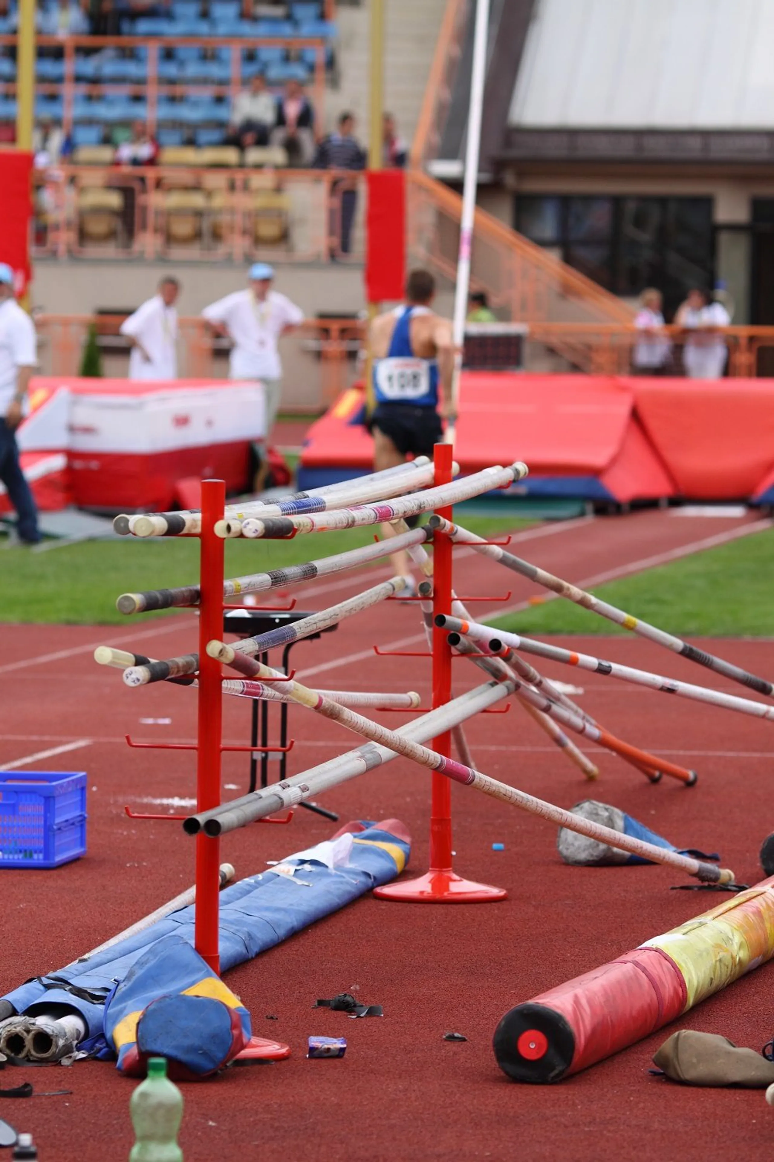 - Keeps vaulting poles and crossbars from being left on the ground.